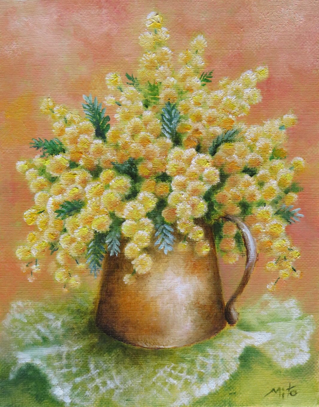 【タイトル】:『水差しポットのミモザ』油絵原画